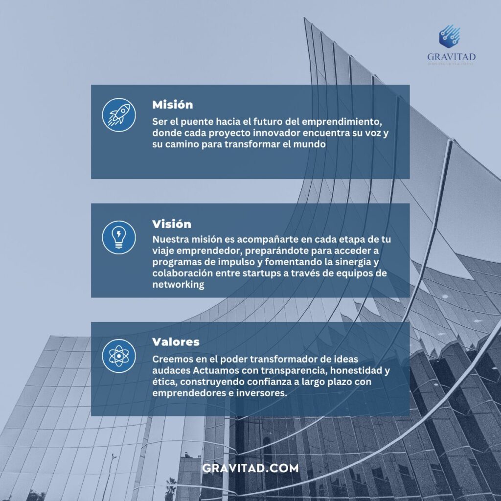 En Gravitad, nuestra visión y misión se centran en ser un puente hacia el futuro del emprendimiento. Apoyamos y promovemos proyectos innovadores que tienen el potencial de transformar el mundo. Creemos en el poder transformador de las ideas nuevas y audaces que desafían el status quo y abren nuevos horizontes. Si tienes una idea innovadora y visionaria, Gravitad es el lugar donde tu proyecto puede florecer y alcanzar su máximo potencial.